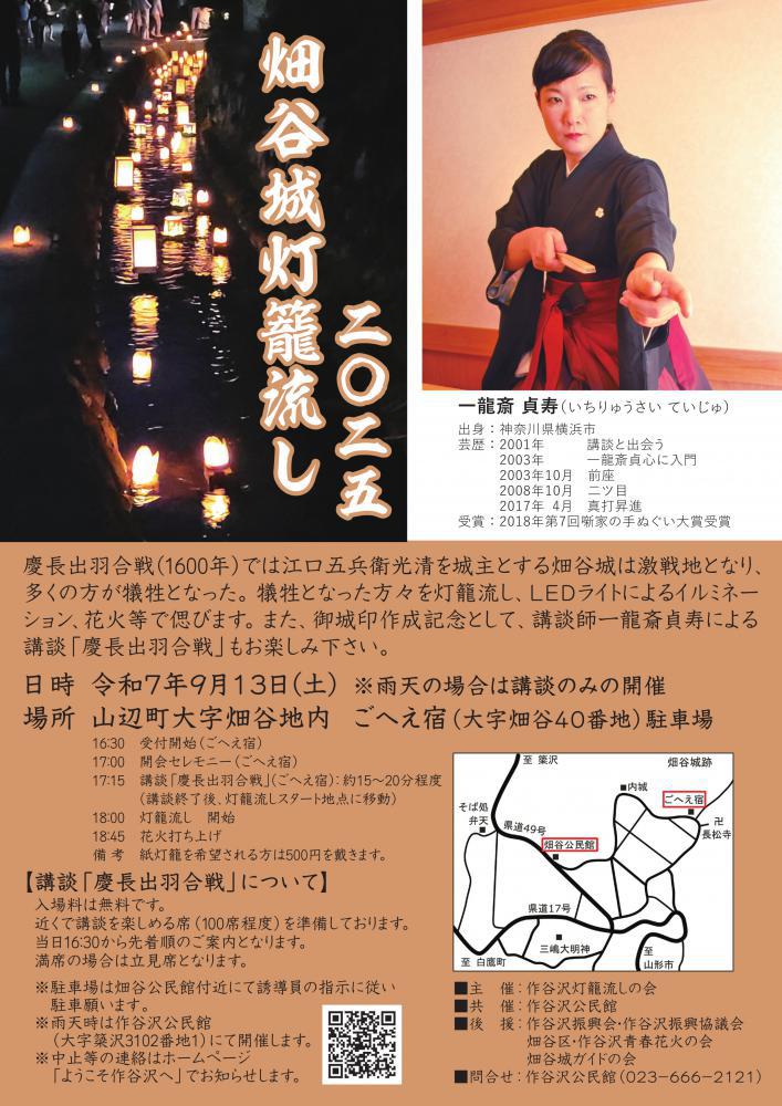 『畑谷城灯籠流し2025』が9月13日(土)に行われます。慶長出羽合戦(1600年)では江口五兵衛光清を城主とする畑谷城は激戦地となり多くの方が犠牲となりました。 灯籠を流し、LEDライトによるイルミネーション、花火等で偲びます。 御城印作成記念として、講談師一龍斎貞寿による講談「慶長出羽合戦」もお楽しみください。【日時】令和7年9月13日(土)※雨天の場合は講談のみ開催    16:30 受付開始(ごへい宿)    17:00 開会セレモニー(ごへい宿)    17:15 講談「慶長出羽合戦」(ごへい宿)15〜20分程度    18:00 灯籠流し開始    18:45 花火打ち上げ【場所】山辺町大字畑谷地内 ごへい宿(大字畑谷40番地)駐車場【講談「慶長出羽合戦」について】入場無料です。近くで講談を楽しめる席(100席程度)ご用意しております。当日16:30から先着順となります。満席の場合は立見席となります。※雨天時は作谷沢公民館(大字簗沢3120番地1)にて開催します。※中止等の連絡はホームページ「ようこそ作谷沢へ」でお知らせします。