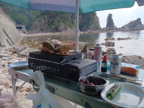 昨日新潟県村上市笹川の354号沿いにある眼鏡岩展望駐車場に車止めて、海岸バーベキュー行きました・・夏の混雑も終わりこの時期だと何とか空いてました・・展望台横にキャンプ可能となる調理洗面台に蛇口2個あり足洗用にも蛇口があるから海水浴にキャンプもできる・・トイレもありトイレ横にも足洗用にと水道がある・・昨日は天気もそこそこで海水温は温かい・・長く入っていても全然大丈夫でしたね・・国名勝で天然記念物で日本百景の「笹川流れ」は、昔から好きな海岸の景勝地。東京に出て山形実家に帰省した時は良くバーベキューしに来ておりました・・駐車場は6台とか7台くらいしか停められないので夏休みメイン時は早く来るとかしないと止められない、「展望案内」にはそれぞれの岩に名前がついて説明書きがあります、左手前が眼鏡岩。穴が一つですが眼鏡岩と名がある・・そして雌獅子岩、潮吹き岩、雄獅子岩、大島だそう・・眼鏡岩のすぐ脇のとがった岩は人に見えるが名前がない? 目立つのにね・・