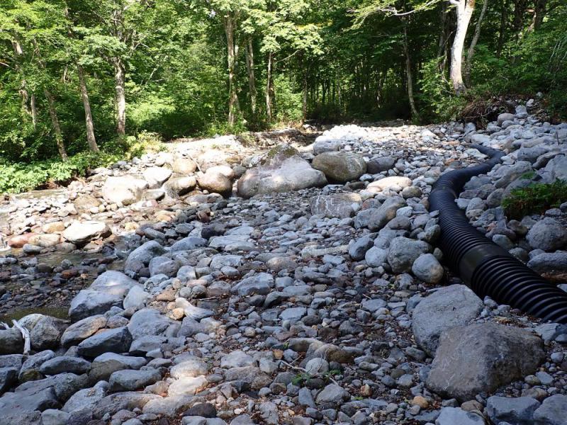 志津温泉に通じる唯一の支水口が博物園エリアにあります。園内にある大きな渓流です。湯殿山と姥ヶ岳の交わりです。今年はご覧の通りの大災害です。早急に工事が始まっています。