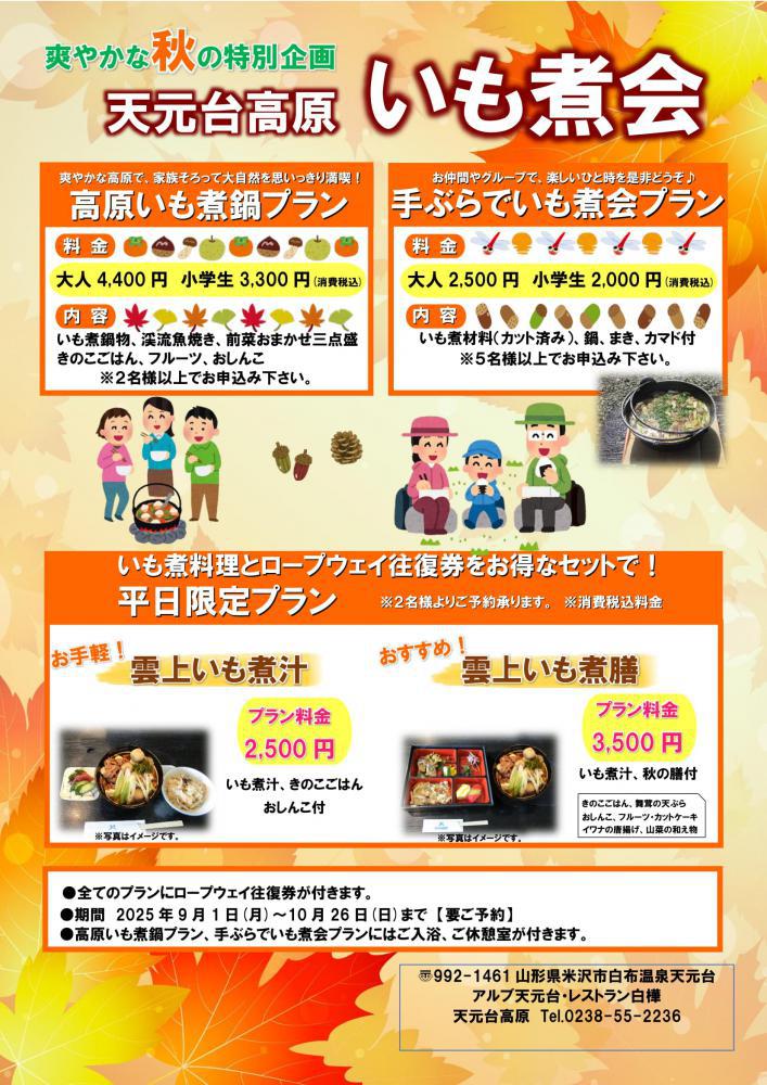秋風かおる西吾妻山、山形の秋の風物詩「芋煮会」のシーズンがやってきました!天元台高原では、「高原いも煮鍋プラン・手ぶらでいも煮会プラン」を9月1日から実施しています。天元台高原の秋を満喫しにぜひお越しください!◇高原いも煮鍋プラン・料金:大人4,400円(税込)小学生3,300円(税込)・内容:いも煮鍋物、渓流魚焼き、前菜おまかせ三点盛    きのこごはん、フルーツ、おしんこ※2名様以上でお申し込みください。※レストラン白樺内でのご提供となります。◇手ぶらでいも煮会プラン・料金:大人2,500円(税込)小学生2,000円(税込)・内容:いも煮材料(カット済)、鍋、まき(かまど付き)※5名様以上でお申し込みください。※飲料、おにぎり等必要な場合は別途ご相談ください。●高原いも煮鍋プラン、手ぶらでいも煮会プラン、どちらにもロープウェイ往復券、ご入浴、ご休憩室が付きます。●開催期間:2025年9月1日(月)〜10月26日(日)※要予約:アルブ天元台TEL:0238-55-2236【お問い合わせ】天元台高原 TEL:0238-55-2236