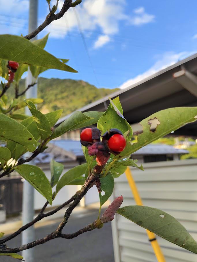 ……これ、なんだと思います?? こぶしの実?種?ふと気づくと、中川公民館の駐車場入り口にある、こぶしの木に異様な赤い塊が…実が割れて、種のような丸いものが見えています。ブドウに岩部山にこぶし…中川ですねー(*´ω`*)