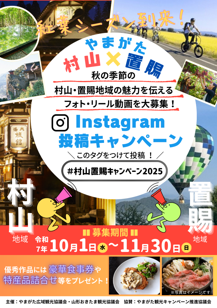 ■ 募集テーマ 秋の村山地域・置賜地域の魅力が伝わる写真・リール動画 季節の風景、自然、街並み、観光地、食べ物、アクティビティ、イベント等、ジャンルは問いません※ 村山地域:山形市、寒河江市、上山市、村山市、天童市、東根市、尾花沢市、山辺町、中山町、河北町、西川町、朝日町、大江町、大石田町※ 置賜地域:米沢市、長井市、南陽市、高畠町、川西町、小国町、白鷹町、飯豊町■ 応募期間 2025年10月1日(水) 〜 2025年11月30日(日)■ 応募方法@ 次のInstagramアカウントを両方フォロー @yamagata_murayama_kouikikanko@okitamakankoA 次の両方を行い、撮影地や撮影内容をキャプション内で明記し、写真・リール動画を投稿してください・ 下記ハッシュタグを付ける 「#村山置賜キャンペーン2025」・ 下記アカウントをタグ付け、またはキャプション内に記載する 「@yamagata_murayama_kouikikanko」■ 賞品○ 最優秀賞(計2点) 食事券(1万円相当)○ 優秀賞(計8点) 村山・置賜地域の特産品(5,000円相当)■ 応募規約 応募規約