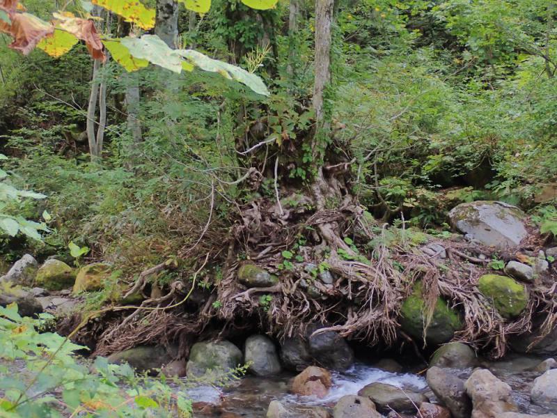 ここを渡ってリュウキンカ沼へ。ここの橋は増水毎に流されてしまう。今回は川底から抉られ、流石のたまり場になり、対岸の巨木サワグルミが半数はろしゅつしてました。表皮に付く地衣類を捜しては眺めたものです。サワグルミの倒木、今まで観た事無し。将に護岸の神様です。