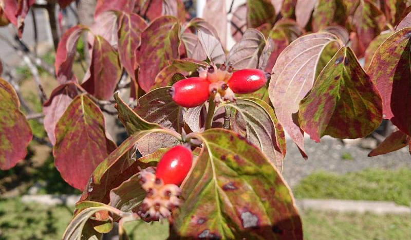 ●「アメリカハナミズキ」の実が真っ赤になりました 青い空の中に真っ赤な実が秋の深まりを実感させてくれます 孫の二分の一成人式を記念して孫の家の庭に植えてあげた記念の樹ですが竹の支えも外し支えなしでも自立できる木になりました 孫も自立に向け成長し今年二十歳になります 子どもの成長もそうですが樹木の成長も知らず知らずのうちに成長し驚いています