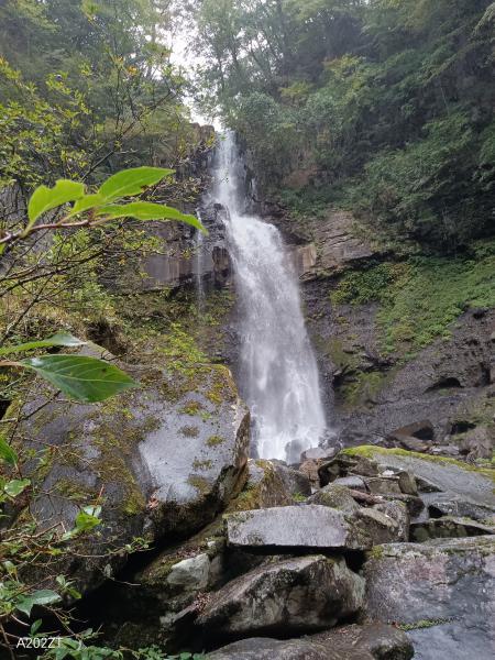 パワースポットである「銚子ヶ滝」ちょうしがたき。名前の由来は水が落ちている姿が酒を入れる銚子に似ていることからつけられたとある、高さ48mあり、日本の滝100選で、また「ふくしまの水30選」にも選ばれています。昨日、10月7日、和尚山登山で寄ってみた・・登山道の途中、案内看板に滝まで300mとある・・急な階段でたどり着くまでは、かなり険しいですね・・昨日は雨で滑りやすいとこがいくつかありました・・なめてかかってはいけません、軽い観光ではまずいところですね、到着するまでの道中では近づくに連れ滝の水しぶきの音が聞こえて来ます。昨日はあいにくの雨、夏なら、最高な涼しい気持ちになりますね、二段構成のような形になっています・・