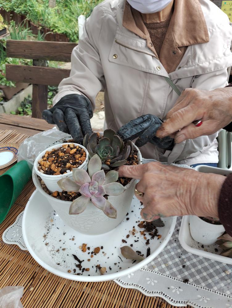 大きくて、暴れが期待できるパープルディライトと朧月をえいやっと差し込み、あれ?山のてっぺんにこれはおかしいか?…と、配置を相談すると、それはおかしいよ!これはこっち!と容赦なく先生からの指導と手直しが入ります(笑)でもその何倍も、良いじゃない!最高!!と褒めていただきながら、どんどんと植え込んでいき、追加でまた苗を抜いては足して、メインは完成!あとは隙間にセダムを数種類植え込んでいきます。この色も良いよ!ばらかさずにある程度種類をまとめて差し込むと良いよ!少ないのもダメだけど、多すぎてもだらしなくなるとのこと……加減が難しいな…と思いながらも差し込むとやめられず、まぁ良いか!勿体ないし入れ込んじゃえ!とミチミチに詰め込んでしまいました。何はともあれ、完成!!とても楽しい2時間でした。基本料金はお一人2,000円ですが、鉢の大きさや抜き苗の数によって加算されます。苗も抜き放題、セダムも、使い放題、貴重な根つき葉挿しのお土産もついてとってもお得!日程は調整可能とのことですので、是非この機会にお申込みください(*^-^*)今月末まで。男性も歓迎です☆