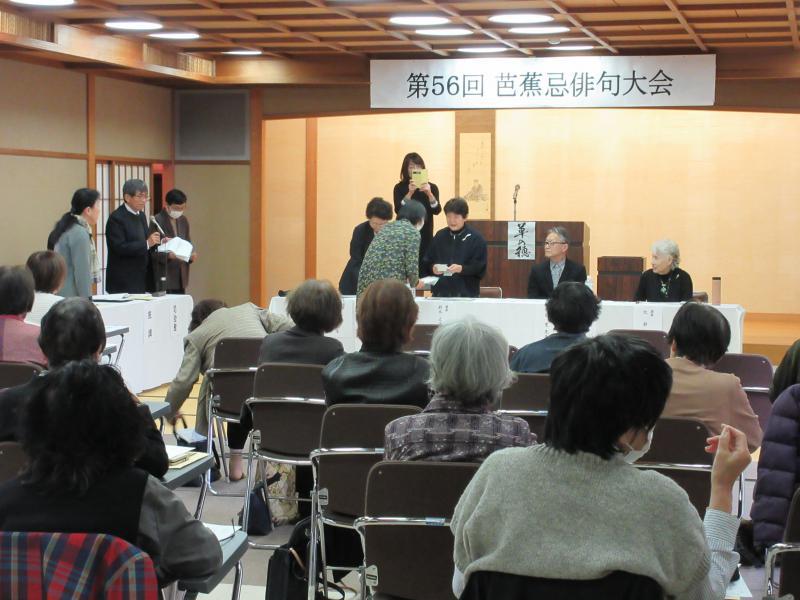 10月26日、芭蕉の命日10月12日(新暦)にちなみ第56回芭蕉忌俳句大会が開催されました。開会に先立ち、選者による献句が行われ、和やかな雰囲気の中、成功裡に終了しました。来年も皆様の参加をお待ちしています。